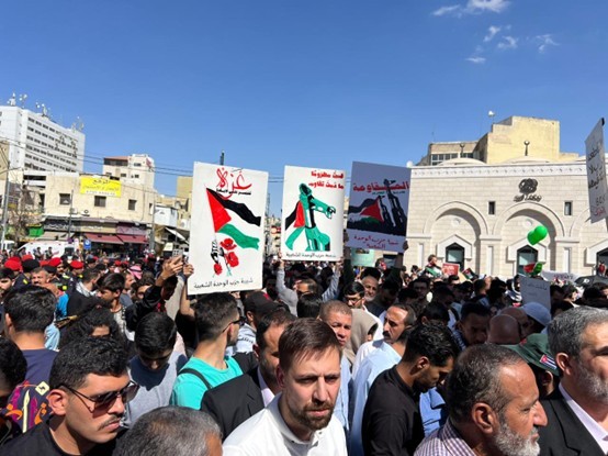 انطلقت في العاصمة الأردنية عمّان وعدد من المحافظات في الأردن، اليوم الجمعة 10 تشرين الأول/ اكتوبر، مسيرات حاشدة لإحياء الذكرى الثانية لمعركة طوفان الأقصى، والتعبير عن الفرح بإنهاء حرب الإبادة "الإسرائيلية" على قطاع غزة بعد أكثر من عامين.