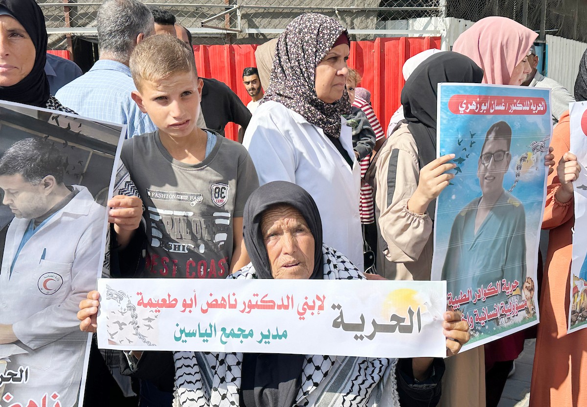 شارك عشرات الفلسطينيين في وقفة احتجاجية داخل مستشفى ناصر بمدينة خان يونس جنوب قطاع غزة، اليوم السبت 18 تشرين الأول/أكتوبر 2025، للمطالبة بالإفراج الفوري عن الأطباء والممرضين والعاملين في المجال الطبي الذين تعتقلهم قوات الاحتلال "الإسرائيلي" منذ أشهر.
