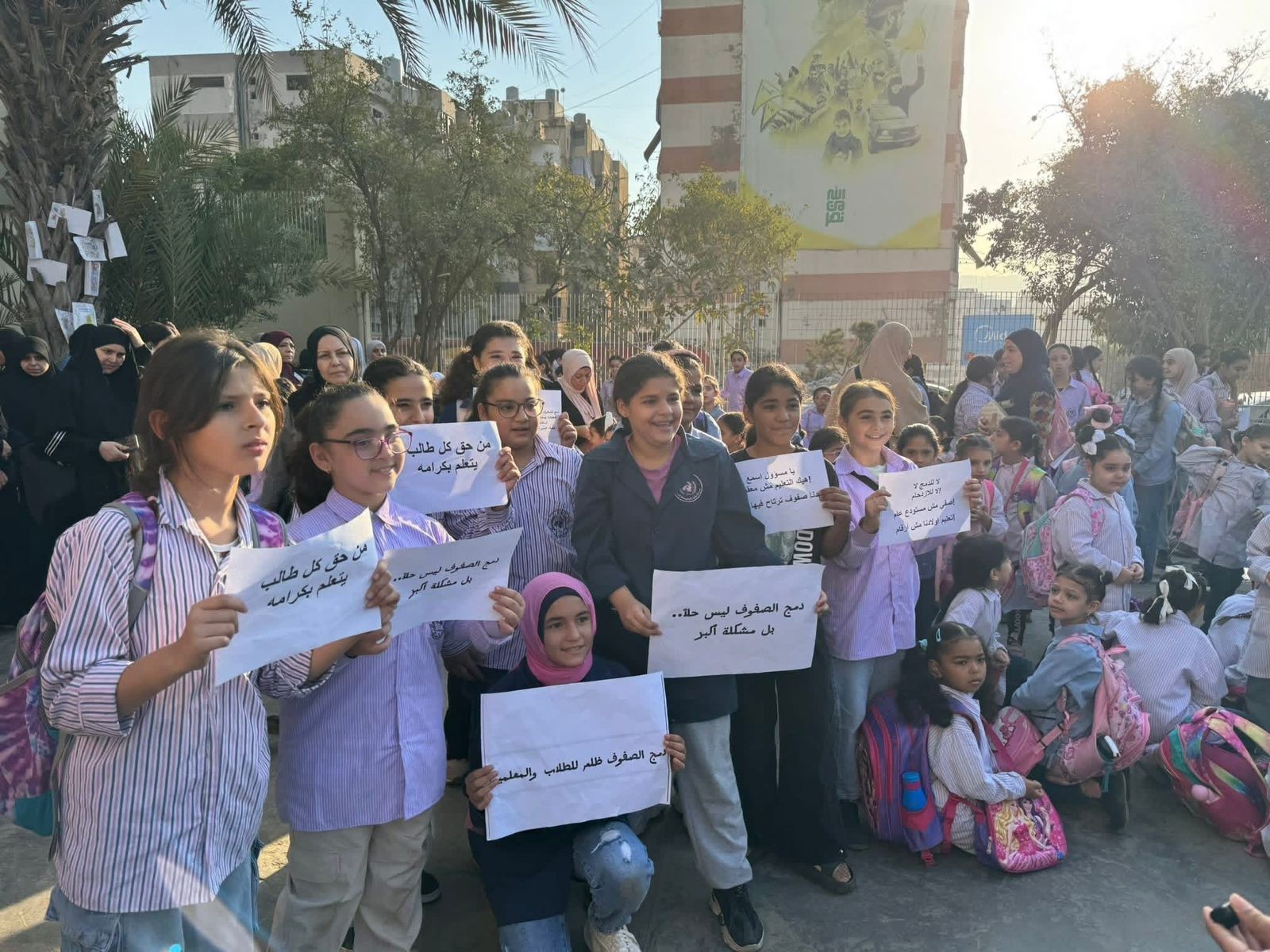 ورفع الطلاب والأهالي لافتات كتب عليها: "لا لدمج الصفوف"، "من حقنا أن نتعلم بكرامة"، و"المقعد بساع طالبين ما بساع ثلاثة"، مطالبين "أونروا" بـالتراجع الفوري عن القرار الذي جعل عدد الطلاب في بعض الصفوف يتجاوز أربعين طالباً، مما يهدد سلامة الأبناء ومستقبلهم التعليمي.