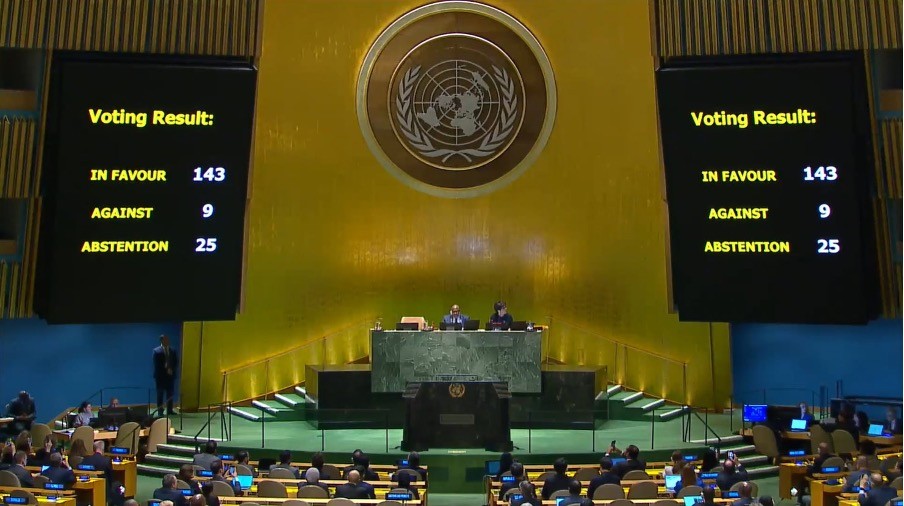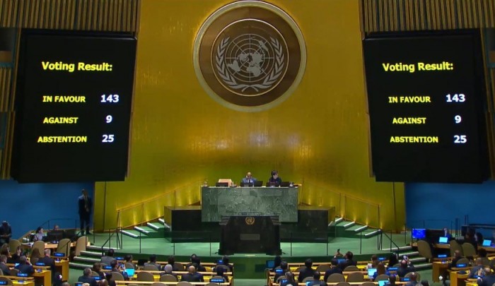 أما القرار المتعلق بالمستوطنات "الإسرائيلية" في الأرض الفلسطينية المحتلة بما فيها القدس والجولان السوري المحتل، فقد حظي بأغلبية 146 دولة مقابل اعتراض 13 دولة وامتناع 17.