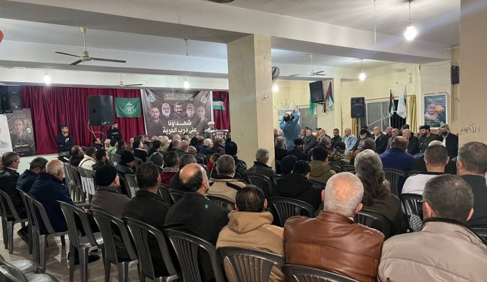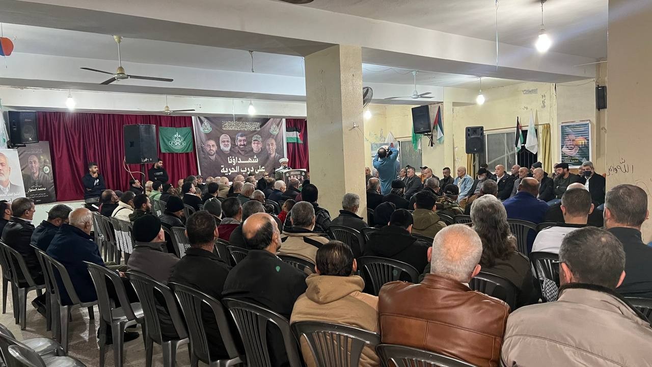 نظّمت حركة حماس، في مخيم برج الشمالي جنوبي لبنان، مساء الثلاثاء 30 كانون الأول، لقاء تبريكات باستشهاد عدد من قادتها العسكريين بينهم الناطق باسمها "أبو عبيدة" في قطاع غزة، وذلك في قاعة المركز الثقافي الفلسطيني في المخيم.