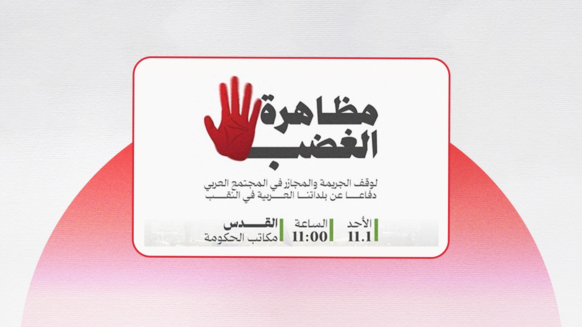 واتخذت المظاهرة المزمع تنظيمها الأسبوع المقبل شعار "مظاهرة الغضب: لوقف الجريمة والمجازر في المجتمع العربي، دفاعًا عن بلداتنا في النقب" ضمن دعوة أعقبت اجتماعاً موسّعاً الذي عقدته لجنة المتابعة، أمس الأربعاء، في مدينة رهط.