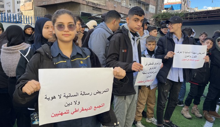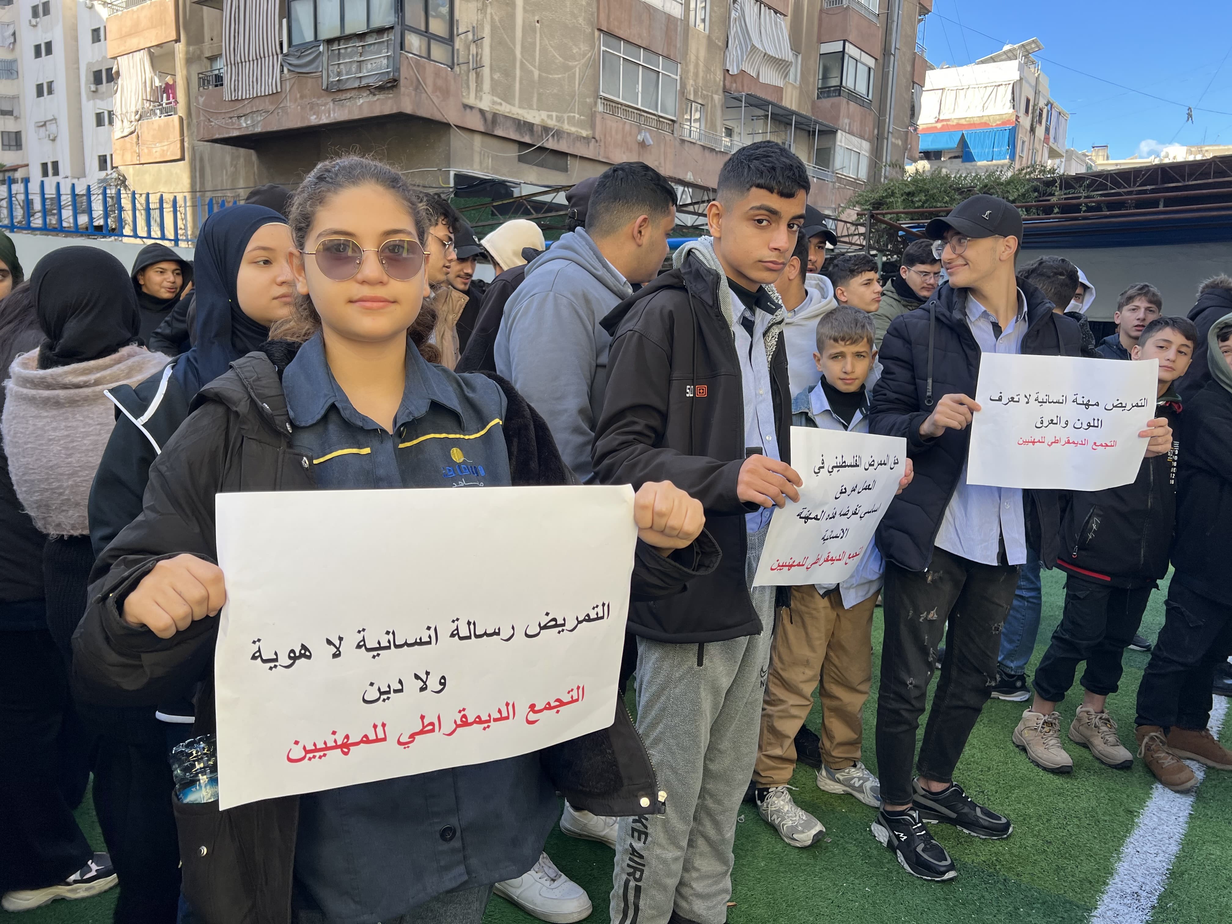 أقام التجمع الديمقراطي للمهنيين الفلسطينيين في لبنان وقفة طلابية حاشدة في معهد الآفاق بمدينة صيدا، رفضًا للقانون اللبناني الجديد، الذي من شأنه حرمان الممرضين الفلسطينيين في لبنان من حقهم في العمل.