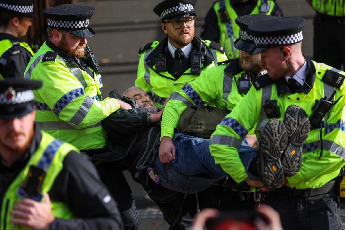 وفي موازاة ذلك، لا يزال خمسة ناشطين من الحركة قيد الاعتقال على خلفية اقتحام قاعدة برايز نورتون الجوية في حزيران/يونيو 2025، حيث تتهمهم السلطات بإحداث أضرار تُقدَّر بملايين الجنيهات الإسترلينية في طائرتين عسكريتين بعد رشّهما بطلاء أحمر.
