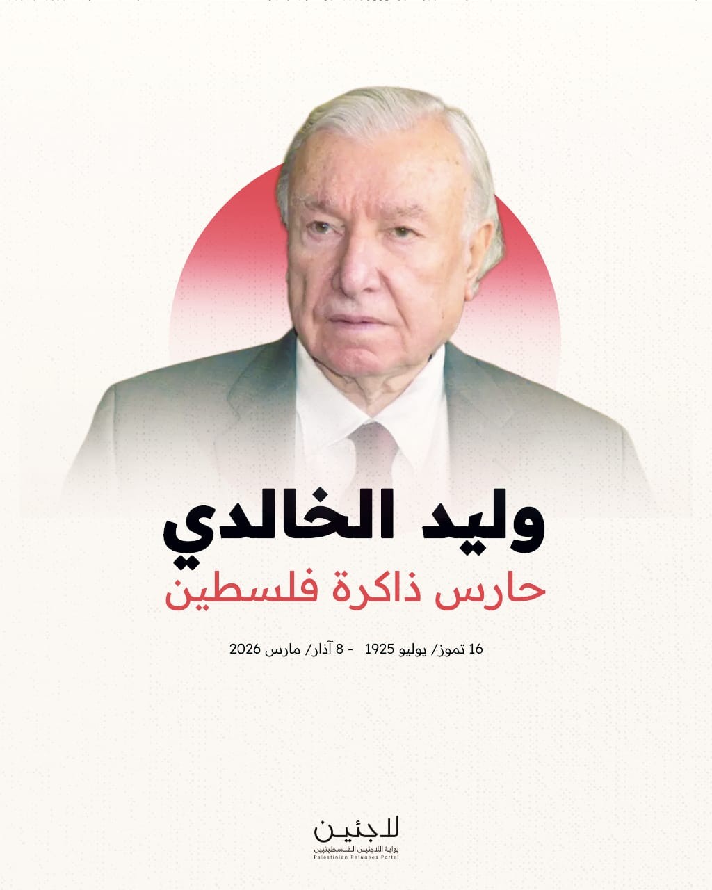 توفي المؤرخ الفلسطيني البارز وليد الخالدي، أمس الأحد 8 آذار/مارس، في الولايات المتحدة الأميركية، بعد مسيرة حياة امتدت لأكثر من قرن، أفنى غالبيتها في توثيق تاريخ فلسطين والدفاع عن الرواية الفلسطينية وحماية الذاكرة الوطنية من محاولات الطمس.