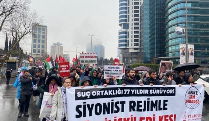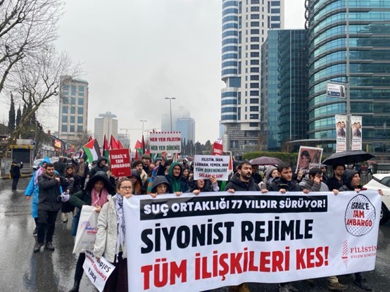 واحتشد المتظاهرون للمطالبة بضرورة سحب الاعتراف الرسمي بـ "النظام الصهيوني" وفرض حظر شامل عليه في مسيرة انطلقت أمس السبت 28 آذار/ مارس، شاركت فيها جموع غاضبة من الأتراك متجهين نحو مبنى قنصلية الاحتلال الواقعة في منطقة "ليفنت" وسط المدينة.