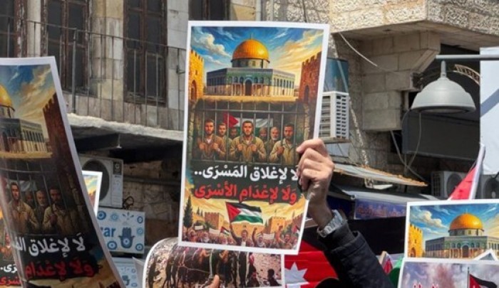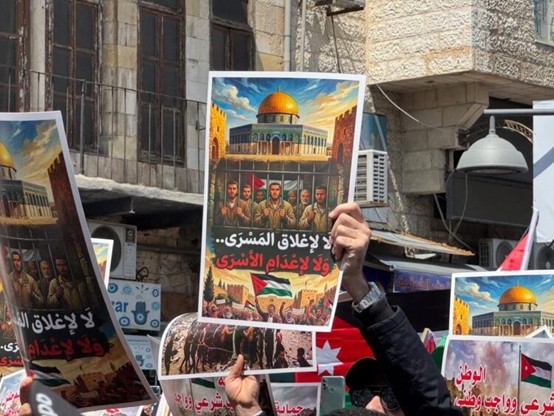 انطلقت مسيرة جماهيرية حاشدة في العاصمة الأردنية عمّان بمشاركة مئات الأردنيين بعد ظهر اليوم الجمعة 10 نيسان/ إبريل، رفضًا لإغلاق المسجد الأقصى المبارك، واحتجاجًا على قانون إعدام الأسرى، الذي اعتبره المشاركون جريمة حرب وانتهاكًا صارخًا للقانون الدولي.